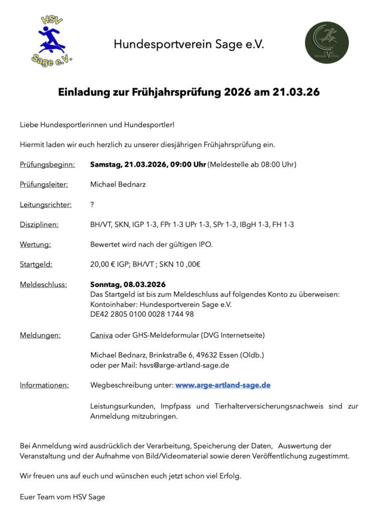 Frühjahrsprüfung 2026 in der ARGE Dezember 14, 2025Dezember 14, 2025Michael Bednarz Am 21.03.26 findet eine Frühjahrsprüfung beim HSV Sage statt. Hier die Einladung.
